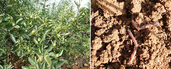 使用效果:未受2013年7月份澇災(zāi)和2014年4月初霜凍影響,果樹(shù)毛細(xì)根多、葉片肥厚濃綠,坐果率高,果實(shí)表面無(wú)斑點(diǎn);在蘋(píng)果園施用松川優(yōu)美肥區(qū)域發(fā)現(xiàn)大量蚯蚓